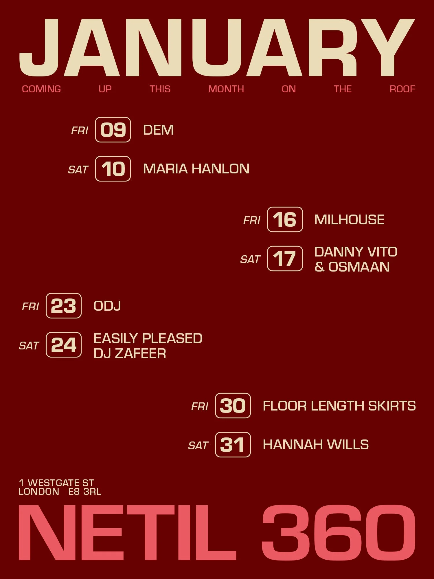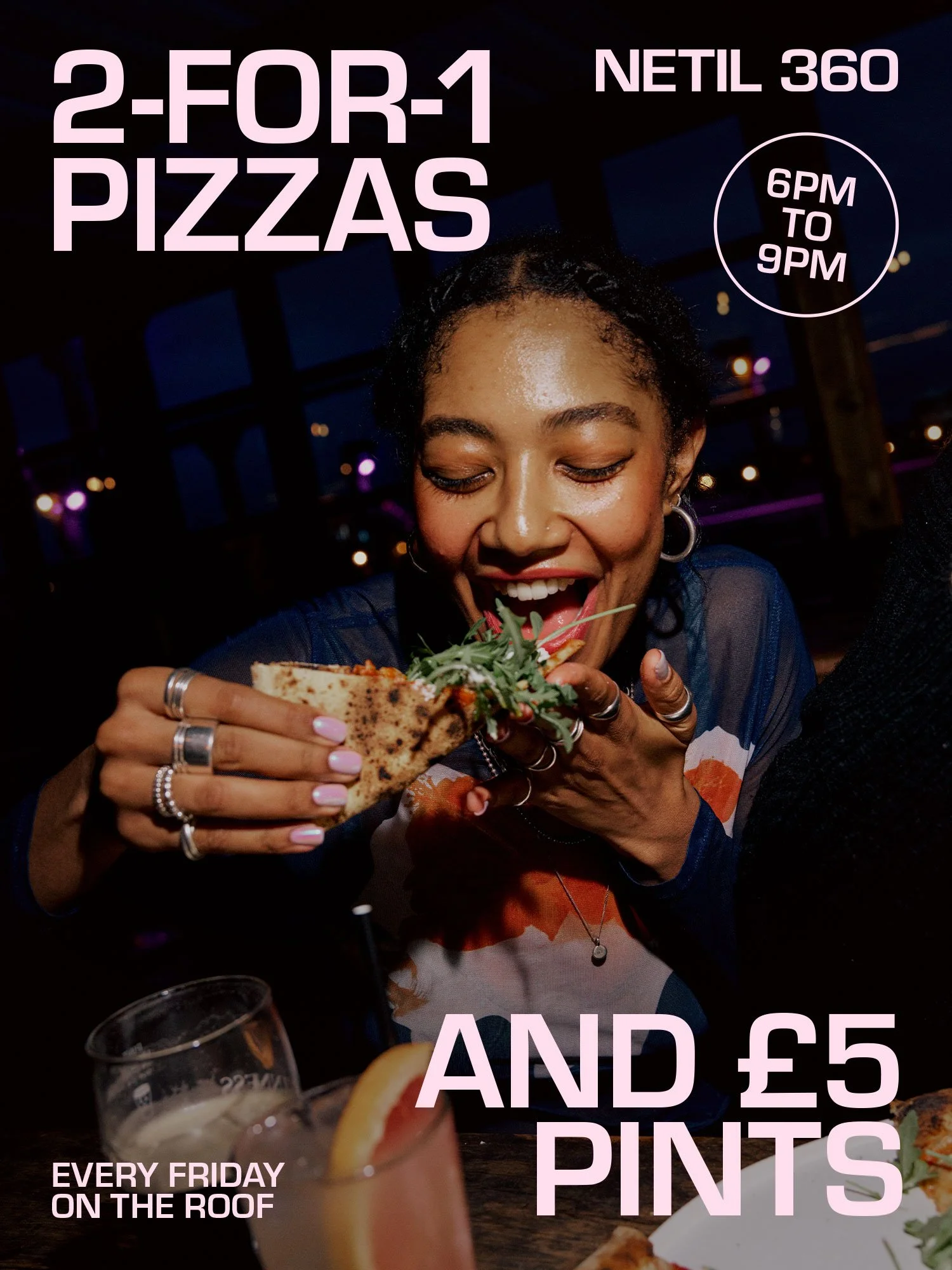Netil360, rooftop bar with panoramic views over London, serving up natural wine, craft beer, cocktails, and stone-baked Neapolitan pizza. Each weekend, a curated lineup of DJs brings soul, hip-hop, house, disco and global sounds to the sky-high dancefloor. Great music, great food, great vibes — all above the city.